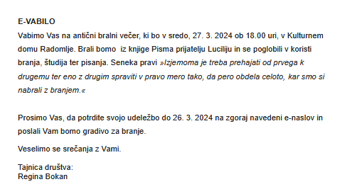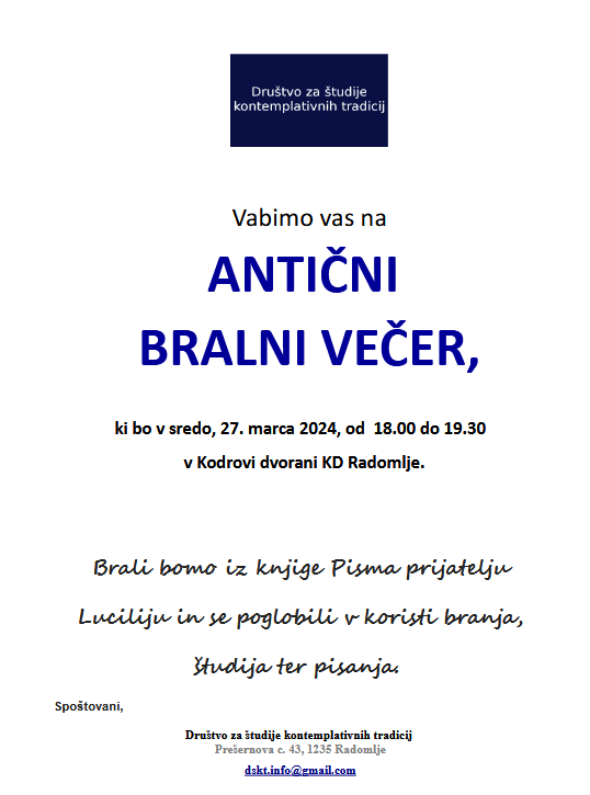 Post author:Peter Post published:21. marca, 2024 Post category:Novice Delite to objavo Share this content Opens in a new window Opens in a new window Opens in a new window Opens in a new window You Might Also Like Fotografska razstava Balerine, 3. 2. 2025 ob 18.30 uri 25. januarja, 2025 BRALNI VEČER antičnih klasičnih del TOREK 28. 11. 2023 22. novembra, 2023 S Pikovo konjenico od Krtine do morja 26. oktobra, 2022